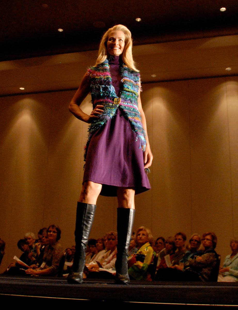 I'll continue my description and pictures from the Stitches Midwest 2010 fashion show. We have reached the more sensible part of the program, so many of these designs are practical and suited to the office.This design is called Nuss/ It is done in Berocco Blackstone Tweed.